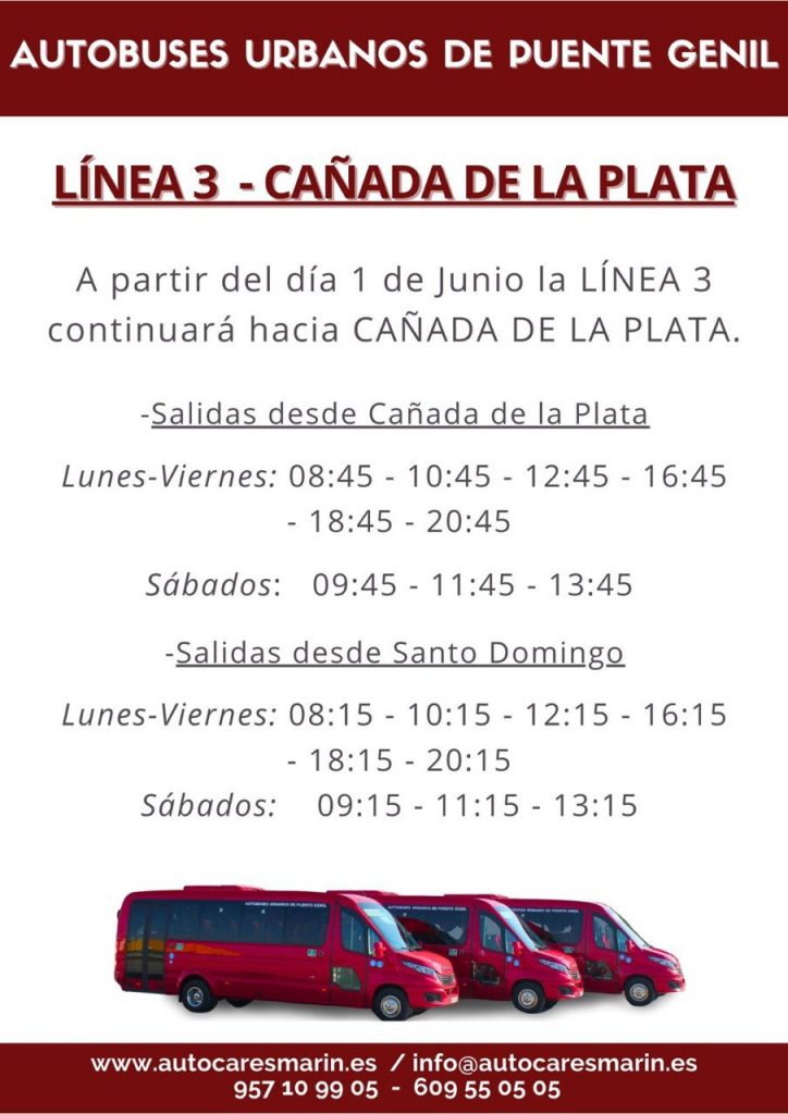 En el Decreto se indica que actualmente, la línea 3 de autobús urbano discurre desde el barrio de Santo Domingo hasta el Hospital de Alta Resolución de Puente Genil, pasando por el centro urbano, zona comercial del Silo, las acacias y Huerto del Francés. La hora de llegada al Hospital de Puente Genil es aproximadamente a los 35 minutos de cada hora de servicio; es decir 8:35, 9:35, 10:35, etcétera…. La hora de salida de este mismo punto se efectúa a los 50 minutos de cada hora de servicio; es decir 8:50, 9:50 y así sucesivamente. “Se produce por tanto un tiempo “muerto” en cada hora de servicio de 15 minutos, en el cual el autobús permanece inactivo en las citadas instalaciones”. “Con objeto de completar la citada Línea “Santo Domingo-Hospital”, ante las demandas vecinales formuladas por los residentes de la urbanización “Cañada de la Plata” y usuarios del club deportivo allí ubicado y, con objeto de mejorar el servicio prestado, se ha planteado la posibilidad de ampliar la esta línea, de forma que aprovechando el tiempo muerto de parada en el Hospital de Puente Genil, el autobús se desplace hasta la urbanización Cañada de la Plata, ampliando el circuito que efectúa dicha línea, sin que el resto de paradas y servicios se vieran alteradas por esta ampliación, continuando en los tiempos y horarios que se vienen ofreciendo. De esta forma, la línea 3 continuará hasta la urbanización Cañada de la Plata, 6 veces al día de lunes a viernes, (tres por la mañana y tres por la tarde, en horario de 08:45, 10:45, 12:45, 16:45, 18:45 y 20:45) y tres veces los sábados (9:45, 11:45 y 13:45)”.