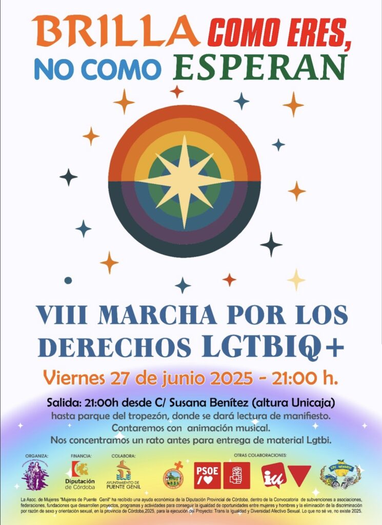 La Asociación de Mujeres de Puente Genil ha anunciado la celebración de su VIII Marcha del Orgullo LGTBIQ+, una cita que se ha convertido en referente en la localidad para reivindicar los derechos y la visibilidad del colectivo. El evento tendrá lugar el próximo viernes con salida a las 21:00 horas desde la calle Susana Benítez, en las inmediaciones del Parque del Romeral, y culminará en el Parque del Tropezón, donde se leerá un manifiesto en favor de la igualdad, el respeto y la tolerancia.Este año, la marcha cobra un significado especial al conmemorarse el 20º aniversario del matrimonio igualitario en España, motivo por el cual la organización ha preparado una bandera inclusiva de 15 metros de longitud que será portada colectivamente a lo largo del recorrido. Desde la Asociación de Mujeres se hace un llamamiento a la participación activa de la ciudadanía: “Queremos que la gente se anime a ondear esta bandera por nuestras calles, para dar visibilidad a quienes todavía viven con miedo al rechazo y la discriminación”.Laura Ruiz, secretaria de la Asociación de Mujeres de Puente Genil, ha expresado su deseo de que el evento tenga una gran acogida: “Es una marcha para todas las personas, un gesto colectivo de apoyo y reivindicación de derechos. Rogamos la colaboración de los medios y de la sociedad pontanesa para que el mensaje llegue lo más lejos posible”