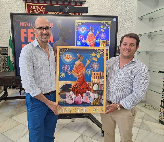 El concejal de Festejos, Joaquín Reina, y el autor del cartel de la Feria Real de Puente Genil, Enrique Reina, han presentado este jueves a mediodía la obra que ilustrará el principal acontecimiento festivo y social del verano pontanés. En palabras del edil, el cartel “es una fantástica obra de arte realizada por un artista consagrado y con experiencia como es Enrique Reina”. “Estamos muy contentos con su trabajo, porque este año teníamos ganas de que fuese él quien nos ofreciese su visión particular de la Feria”, indicó.